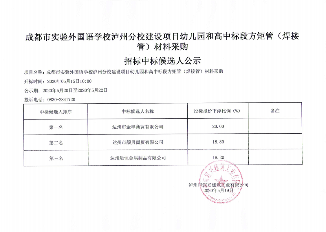 成都市實(shí)驗(yàn)外國語學(xué)校瀘州分校建設(shè)項(xiàng)目幼兒園和高中標(biāo)段方矩管(焊接管)材料采購招標(biāo)中標(biāo)候選人公示 作者: 來源: 日期:2020-05-19 瀏覽次數(shù): 次 【字體:小 大】 【打印正文】