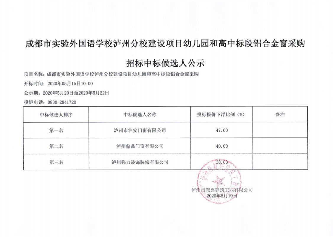 成都市實(shí)驗(yàn)外國語學(xué)校瀘州分校建設(shè)項(xiàng)目幼兒園和高中標(biāo)段鋁合金窗采購招標(biāo)中標(biāo)候選人公示 作者: 來源: 日期:2020-05-19 瀏覽次數(shù): 次 【字體:小 大】 【打印正文】