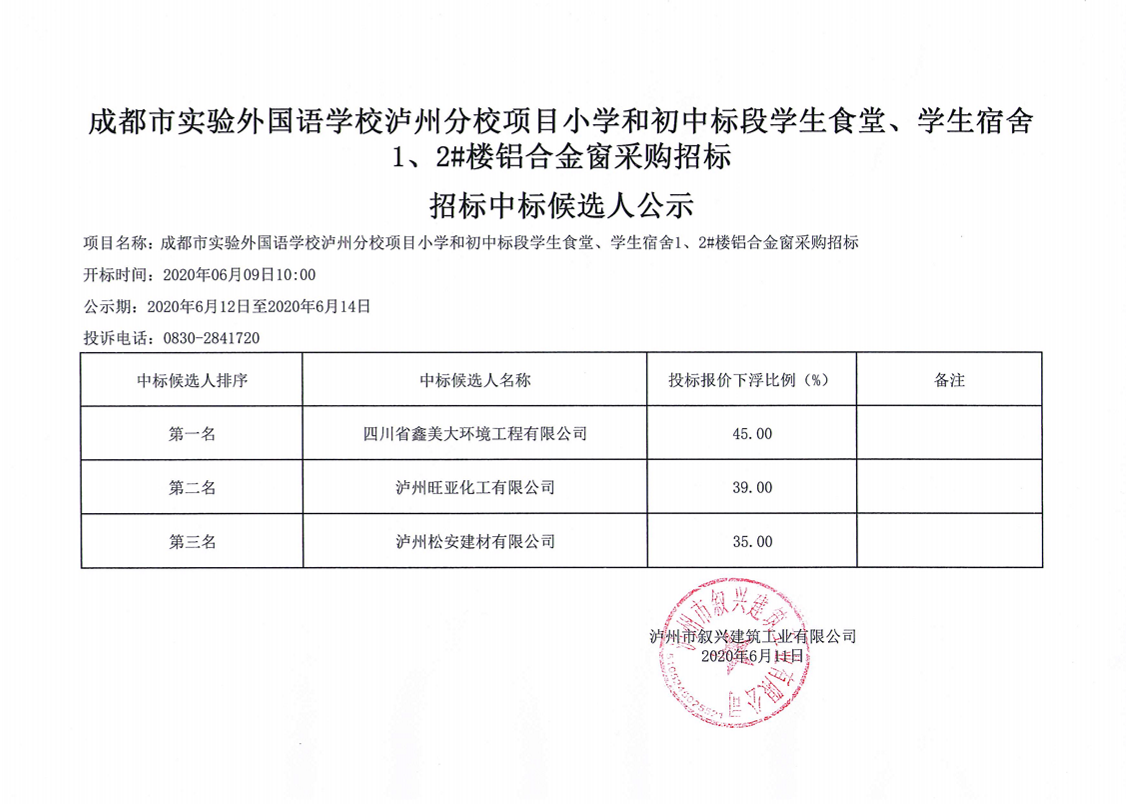 成都市實驗外國語學校瀘州分校項目小學和初中標段學生食堂、學生宿舍1、2#樓鋁合金窗采購招標中標候選人公示 作者: 來源: 日期:2020-06-11 瀏覽次數(shù): 次 【字體:小 大】 【打印正文】