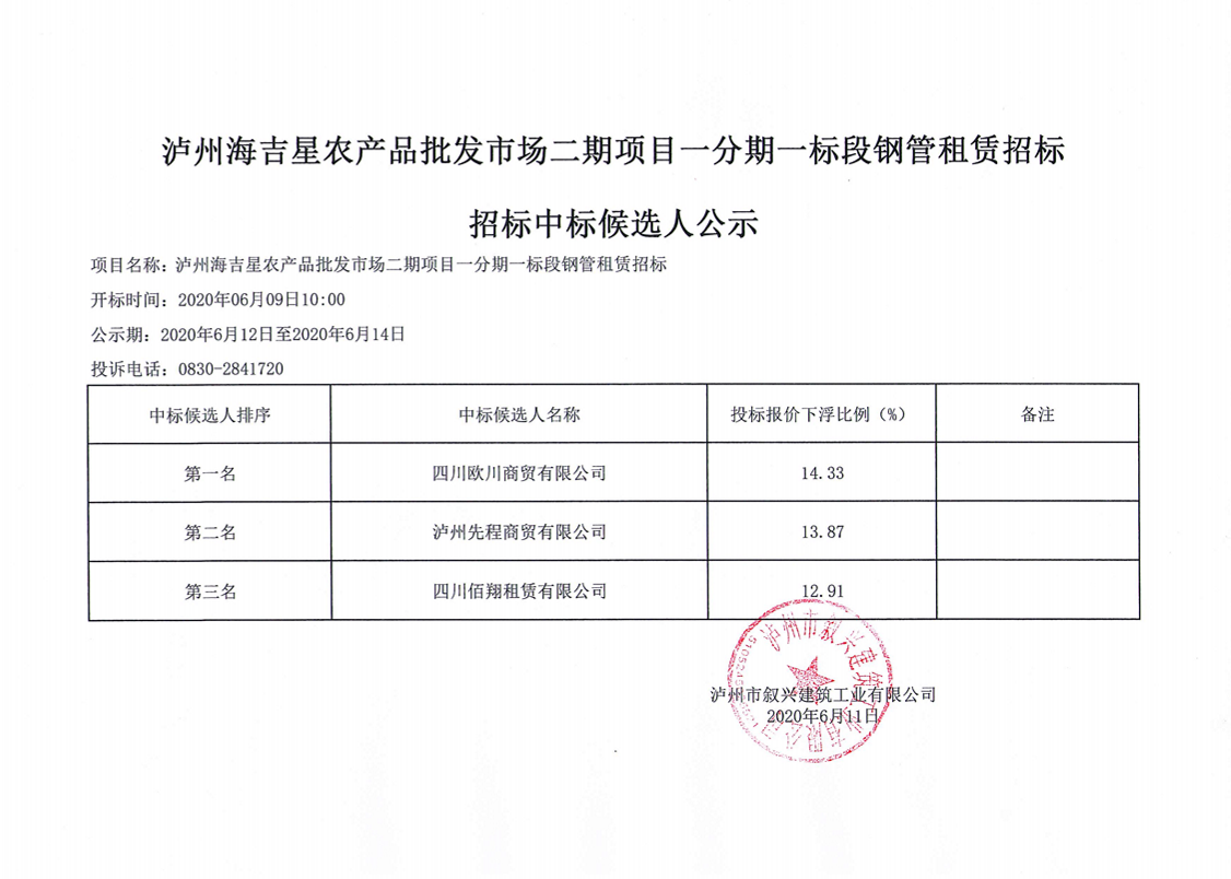 瀘州海吉星農產品批發(fā)市場二期項目一分期一標段鋼管租賃招標中標候選人公示