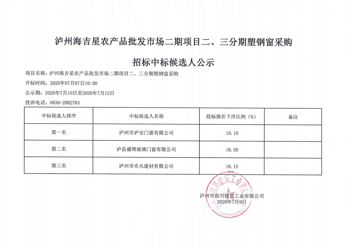 瀘州海吉星農(nóng)產(chǎn)品批發(fā)市場(chǎng)二期項(xiàng)目二、三分期塑鋼窗采購(gòu)招標(biāo)中標(biāo)候選人公示 作者: 來(lái)源: 日期:2020-07-09 瀏覽次數(shù): 次 【字體:小 大】 【打印正文】