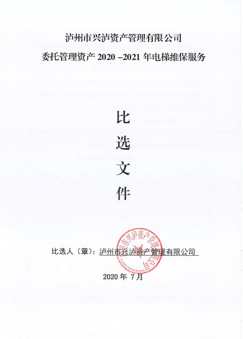 瀘州市興瀘資產(chǎn)管理有限公司委托管理資產(chǎn)2020-2021年電梯維保服務(wù)比選文件 作者: 來源: 日期:2020-07-17 瀏覽次數(shù): 次 【字體:小 大】 【打印正文】