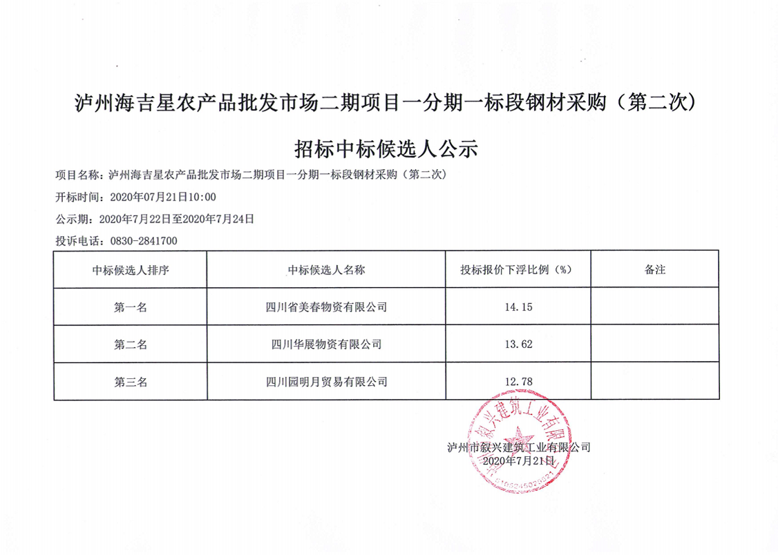 瀘州海吉星農(nóng)產(chǎn)品批發(fā)市場二期項(xiàng)目一分期一標(biāo)段鋼材采購(第二次)招標(biāo)中標(biāo)候選人公示 作者: 來源: 日期:2020-07-21 瀏覽次數(shù): 次 【字體:小 大】 【打印正文】