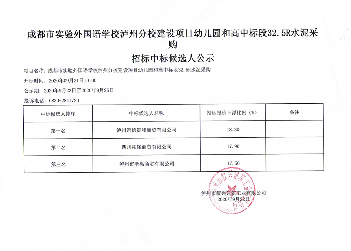 成都市實(shí)驗(yàn)外國語學(xué)校瀘州分校項(xiàng)目幼兒園和高中標(biāo)段32.5R水泥采購招標(biāo)中標(biāo)候選人公示 作者: 來源: 日期:2020-09-22 瀏覽次數(shù): 次 【字體:小 大】 【打印正文】