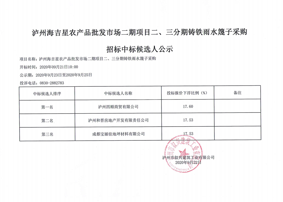 瀘州海吉星農(nóng)產(chǎn)品批發(fā)市場二期項(xiàng)目二、三分期鑄鐵雨水篾子采購招標(biāo)中標(biāo)候選人公示 作者: 來源: 日期:2020-09-22 瀏覽次數(shù): 次 【字體:小 大】 【打印正文】