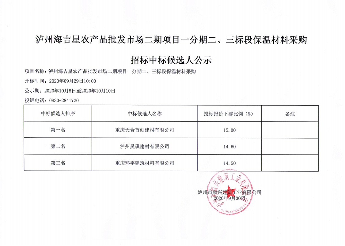 瀘州海吉星農(nóng)產(chǎn)品批發(fā)市場(chǎng)二期項(xiàng)目一分期二三標(biāo)段保溫材料采購(gòu)招標(biāo)中標(biāo)候選人公示 作者: 來(lái)源: 日期:2020-09-30 瀏覽次數(shù): 次 【字體:小 大】 【打印正文】