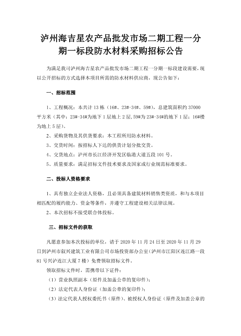 瀘州海吉星農(nóng)產(chǎn)品批發(fā)市場(chǎng)二期工程一分期一標(biāo)段防水材料采購(gòu)招標(biāo)公告 作者: 來(lái)源: 日期:2020-11-23 瀏覽次數(shù): 次 【字體:小 大】 【打印正文】