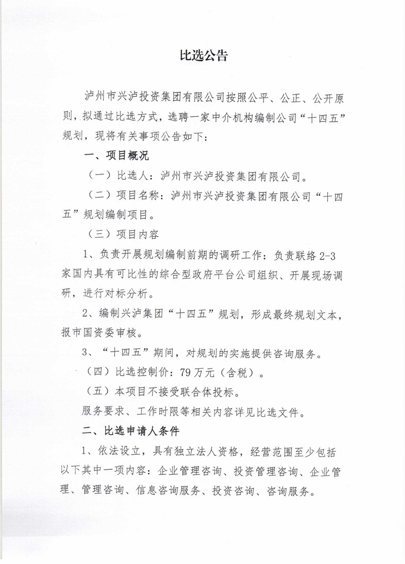 瀘州市興瀘投資集團(tuán)有限公司“十四五”規(guī)劃編制項(xiàng)目比選公告