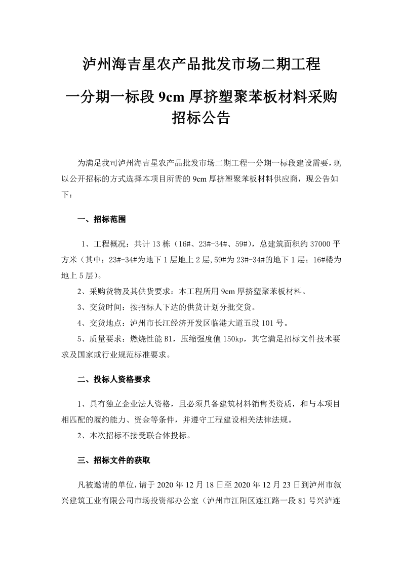 瀘州海吉星農(nóng)產(chǎn)品批發(fā)市場(chǎng)二期工程一分期一標(biāo)段9cm厚擠塑聚苯板材料采購招標(biāo)公告 作者: 來源: 日期:2020-12-17 瀏覽次數(shù): 次 【字體:小 大】 【打印正文】