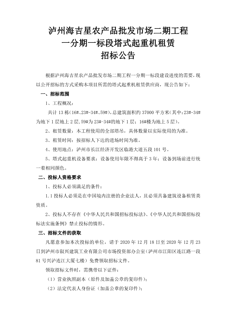 瀘州海吉星農(nóng)產(chǎn)品批發(fā)市場二期工程一分期一標(biāo)段塔式起重機(jī)租賃招標(biāo)公告 作者: 來源: 日期:2020-12-17 瀏覽次數(shù): 次 【字體:小 大】 【打印正文】