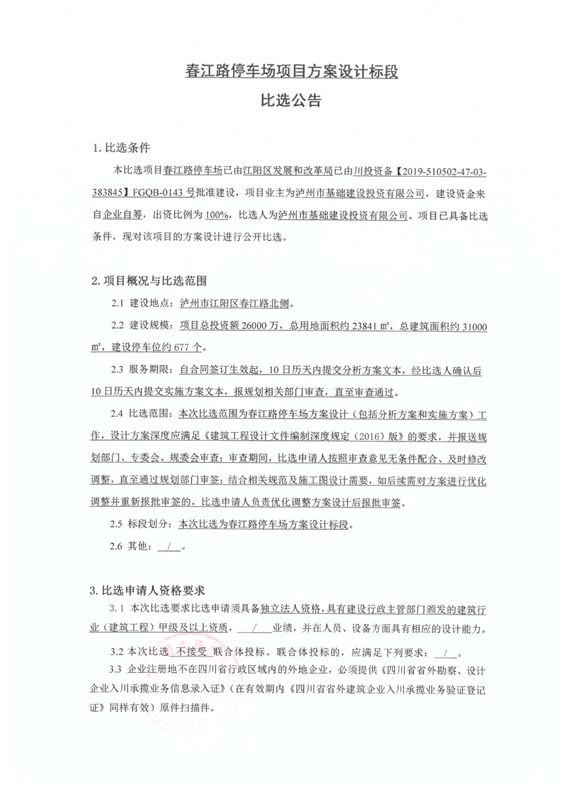 春江路停車場項目方案設(shè)計標段比選公告