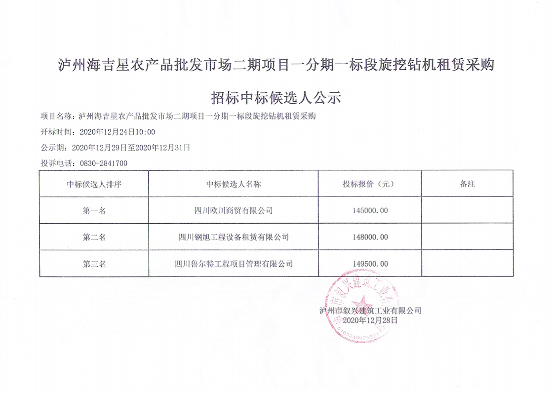 瀘州海吉星農(nóng)產(chǎn)品批發(fā)市場二期項目一分期一標段旋挖鉆機租賃采購招標招標候選人公示 作者: 來源: 日期:2020-12-28 瀏覽次數(shù): 次 【字體:小 大】 【打印正文】