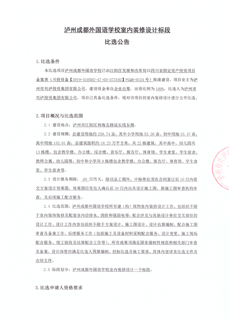 瀘州成都外國語學校室內(nèi)裝修設計比選公告