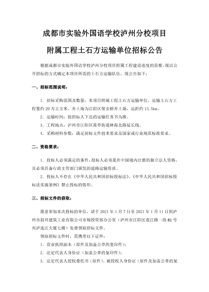 成都市實(shí)驗(yàn)外國(guó)語(yǔ)學(xué)校瀘州分校項(xiàng)目附屬工程土石方運(yùn)輸單位招標(biāo)公告 作者: 來(lái)源: 日期:2021-01-06 瀏覽次數(shù): 次 【字體:小 大】 【打印正文】