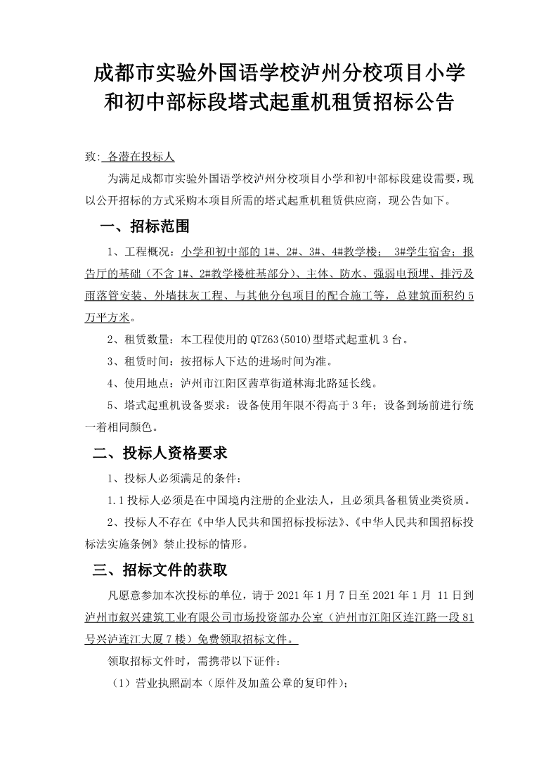 成都市實驗外國語學(xué)校瀘州分校項目小學(xué)和初中部標段塔式起重機租賃招標公告