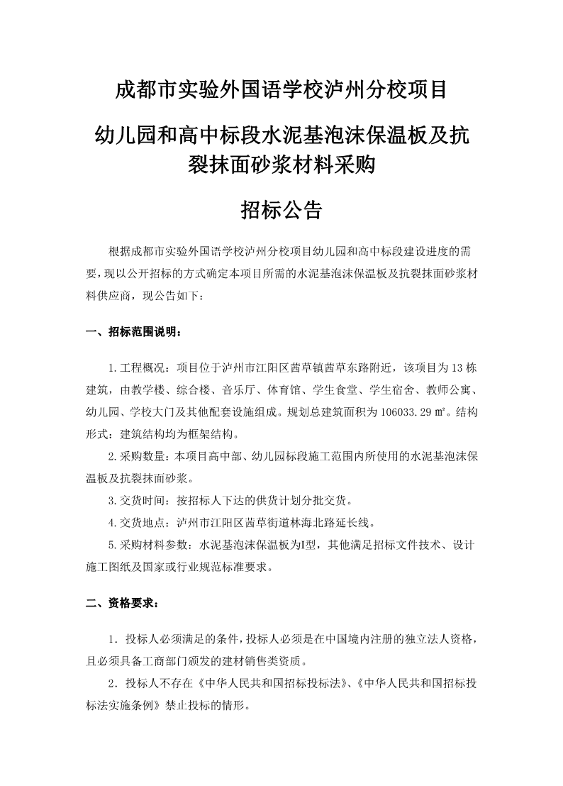 成都市實驗外國語學(xué)校瀘州分校項目幼兒園和高中標(biāo)段水泥基泡沫保溫板及抗裂抹面砂漿材料采購招標(biāo)公告 作者: 來源: 日期:2021-01-06 瀏覽次數(shù): 次 【字體:小 大】 【打印正文】