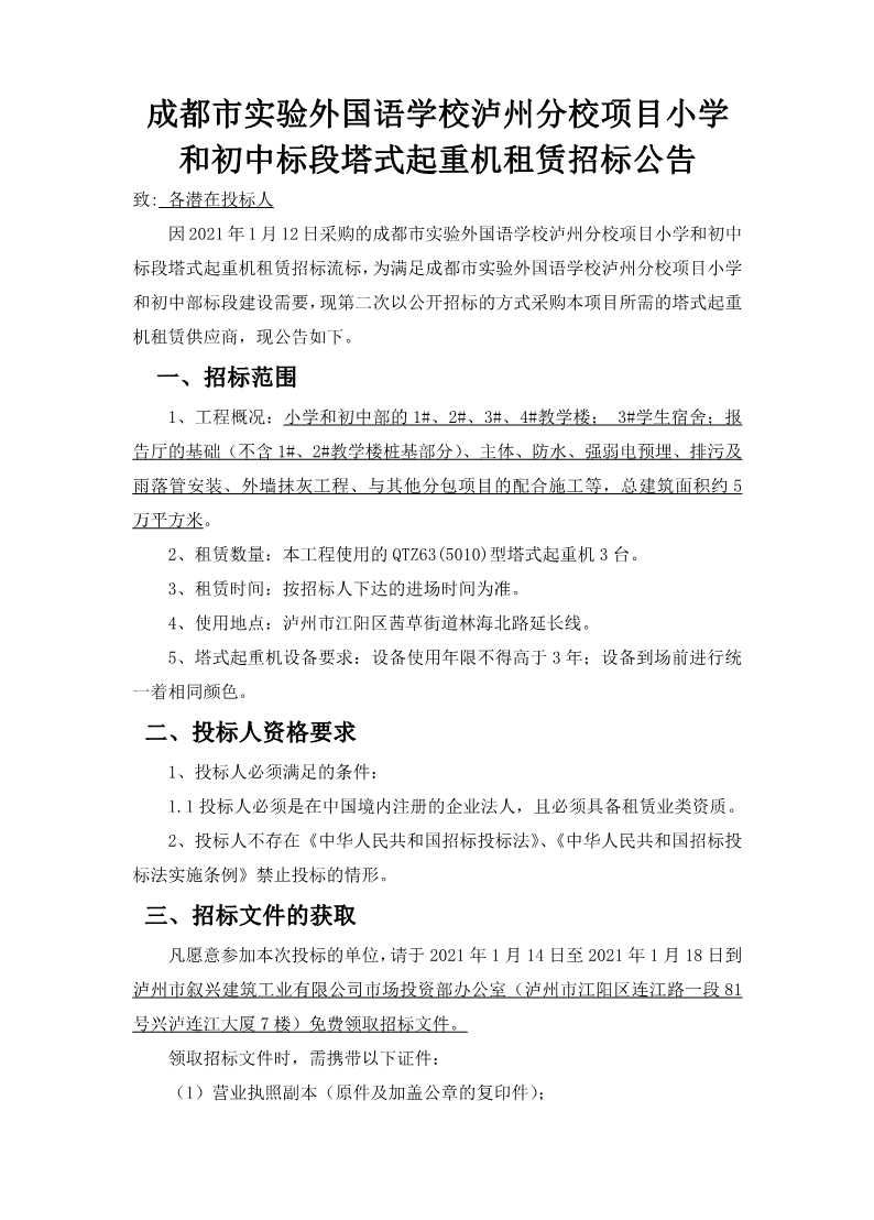 成都市實驗外國語學校瀘州分校項目小學和初中標段塔式起重機租賃招標公告