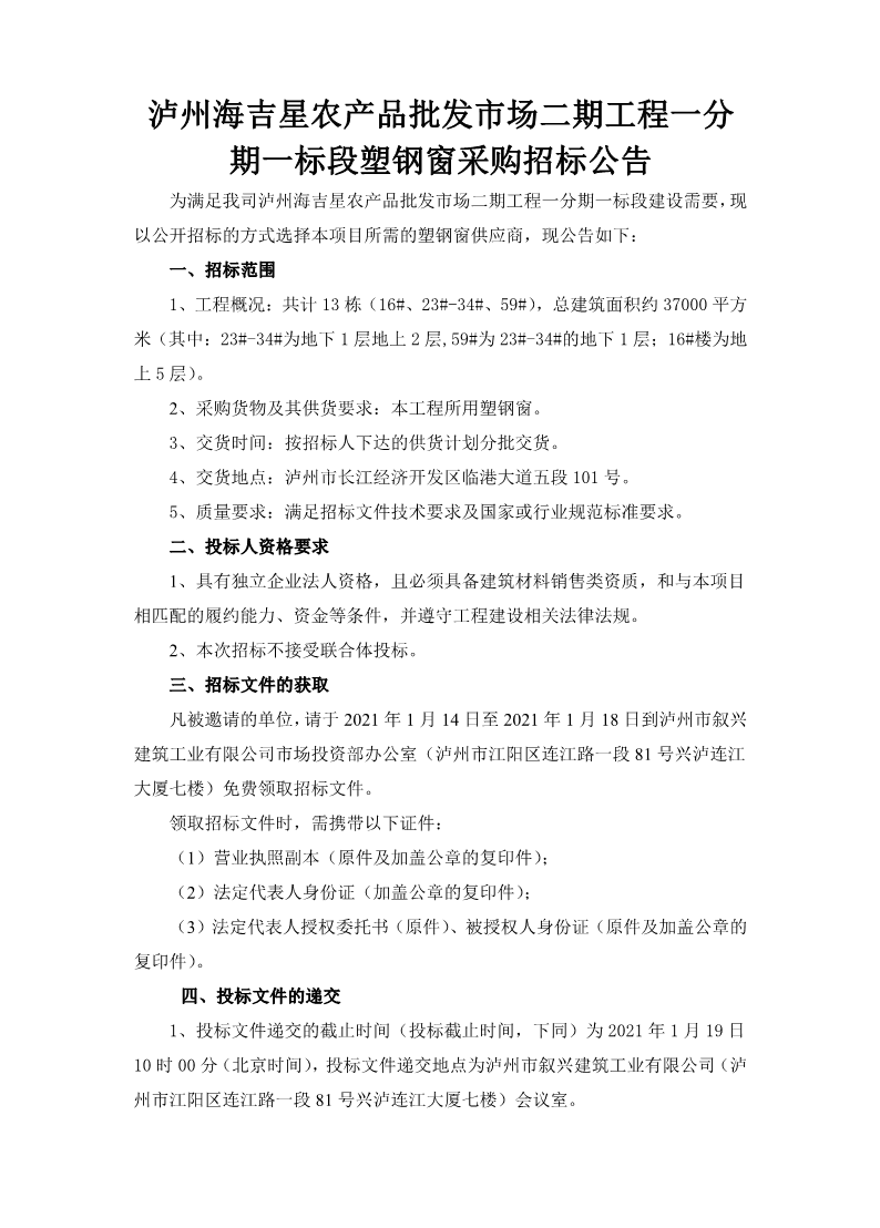 瀘州海吉星農(nóng)產(chǎn)品批發(fā)市場(chǎng)二期工程一分期一標(biāo)段塑鋼窗采購(gòu)招標(biāo)公告 作者: 來源: 日期:2021-01-13 瀏覽次數(shù): 次 【字體:小 大】 【打印正文】