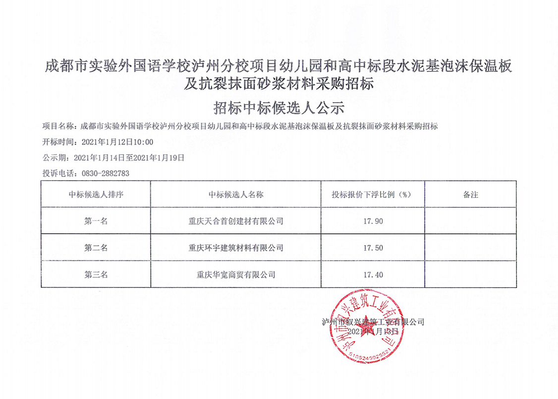 成都市實(shí)驗(yàn)外國(guó)語(yǔ)敘興瀘州分校項(xiàng)目幼兒園和高中標(biāo)段水泥基泡沫保溫板及抗裂抹面砂漿材料采購(gòu)招標(biāo)中標(biāo)候選人公示 作者: 來(lái)源: 日期:2021-01-13 瀏覽次數(shù): 次 【字體:小 大】 【打印正文】