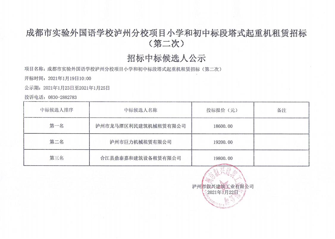 成都市實驗外國語學校瀘州分校項目小學和初中標段塔式起重機租賃招標(第二次)中標候選人公示