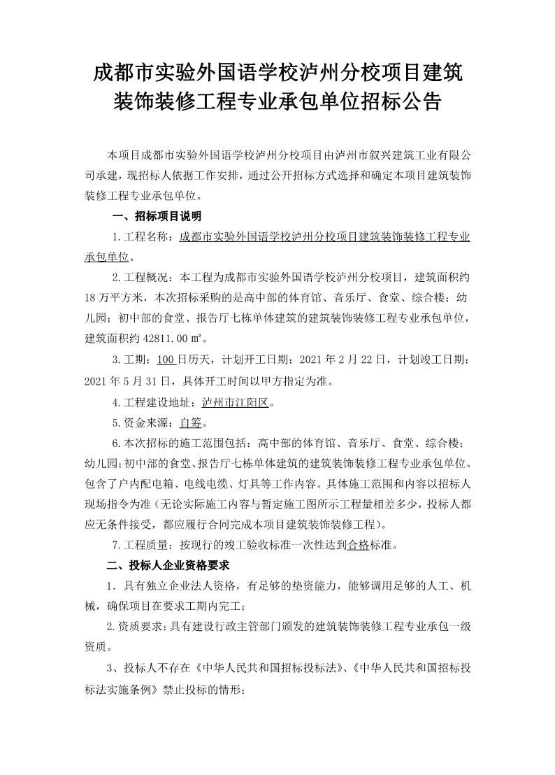 成都市實驗外國語學校瀘州分校項目建筑裝飾裝修工程專業(yè)承包單位招標公告