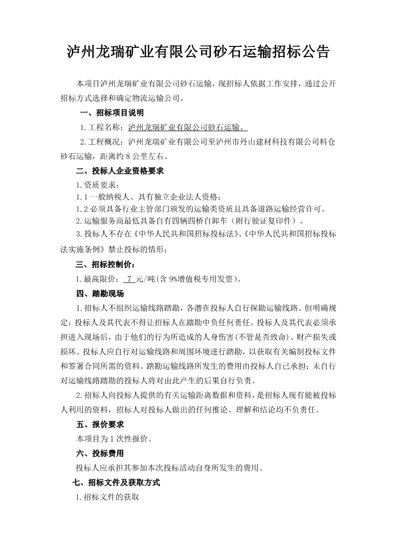瀘州龍瑞礦業(yè)有限公司砂石運(yùn)輸招標(biāo)公告