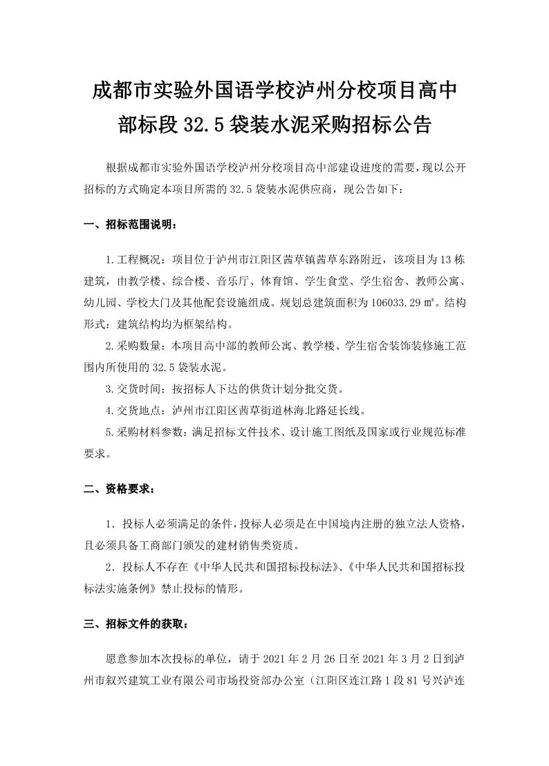 成都市實驗外國語學(xué)校瀘州分校項目高中部標段32.5袋裝水泥采購招標公告