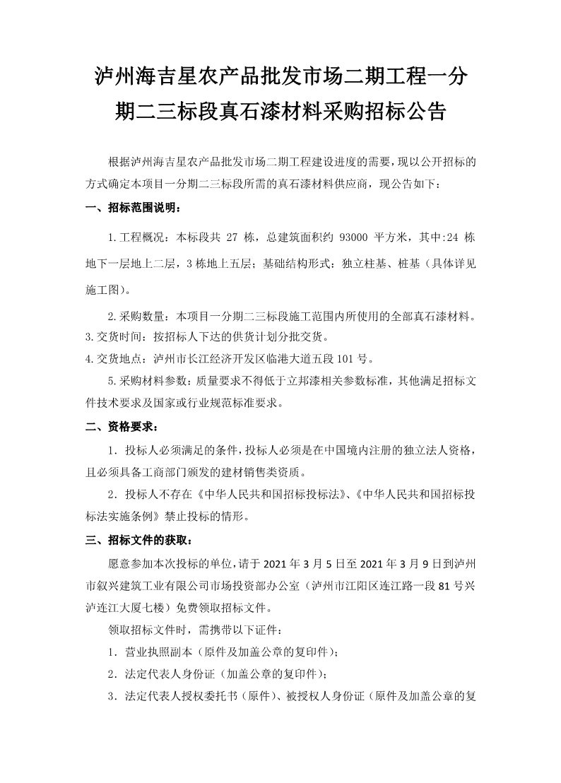 瀘州海吉星農(nóng)產(chǎn)品批發(fā)市場二期工程一分期二三標(biāo)段真石漆材料采購招標(biāo)公告 作者: 來源: 日期:2021-03-04 瀏覽次數(shù): 次 【字體:小 大】 【打印正文】