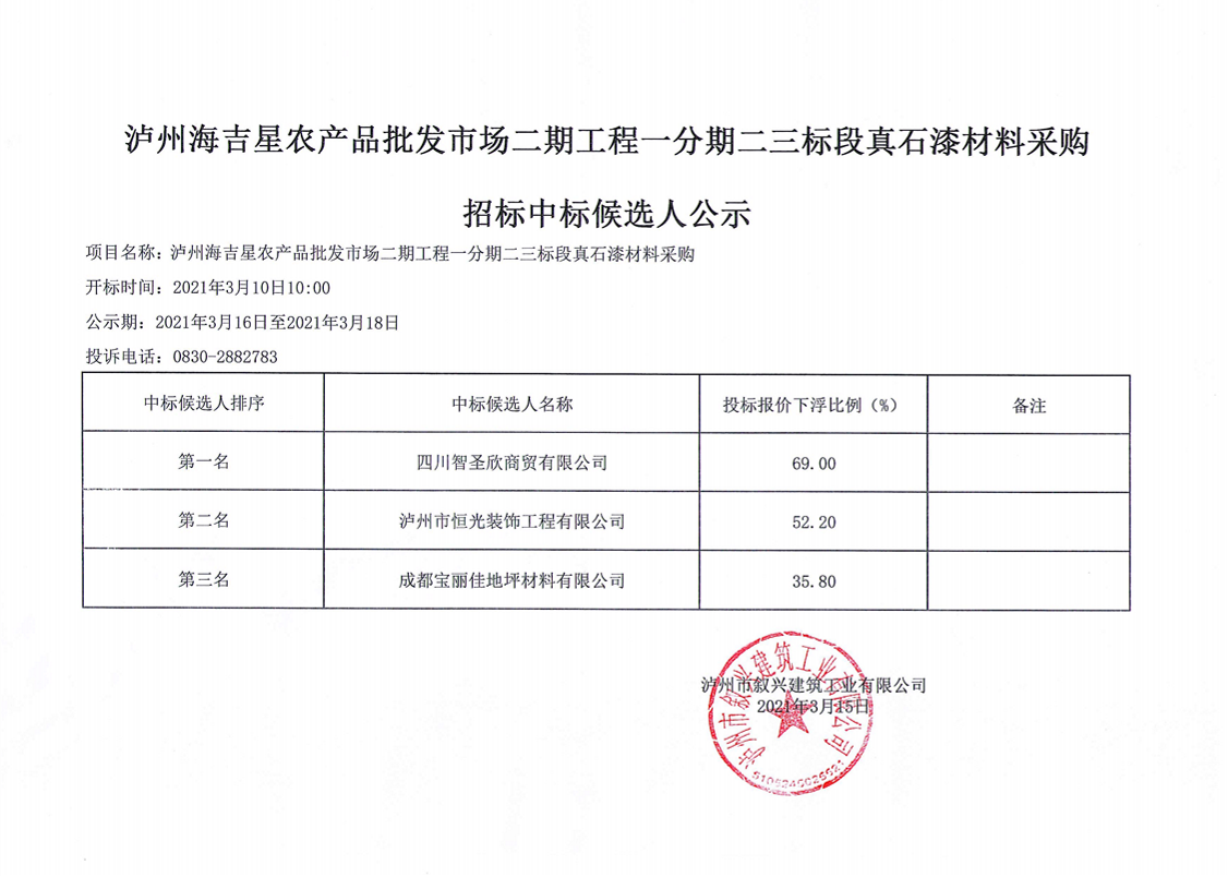瀘州海吉星農(nóng)產(chǎn)品批發(fā)市場二期工程一分期二三標段真石漆材料采購招標中標候選人公示 作者: 來源: 日期:2021-03-15 瀏覽次數(shù): 次 【字體:小 大】 【打印正文】
