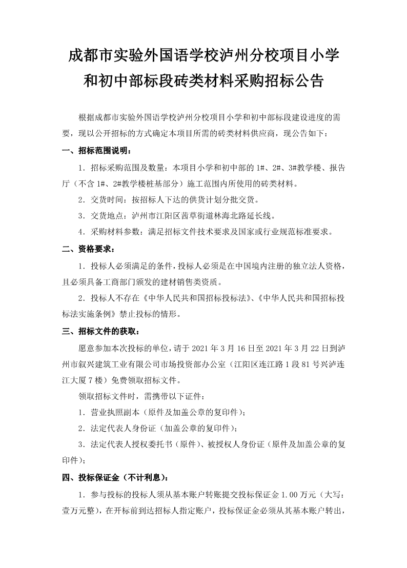 成都市實(shí)驗(yàn)外國語學(xué)校瀘州分校項(xiàng)目小學(xué)和初中部標(biāo)段磚類材料采購招標(biāo)公告 作者: 來源: 日期:2021-03-15 瀏覽次數(shù): 次 【字體:小 大】 【打印正文】