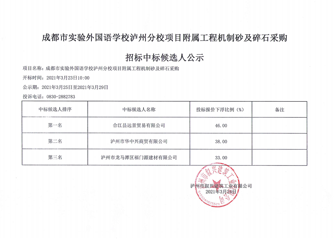 成都市實(shí)驗(yàn)外國(guó)語學(xué)校瀘州分校項(xiàng)目附屬工程機(jī)制砂及碎石采購(gòu)招標(biāo)中標(biāo)候選人公示 作者: 來源: 日期:2021-03-24 瀏覽次數(shù): 次 【字體:小 大】 【打印正文】
