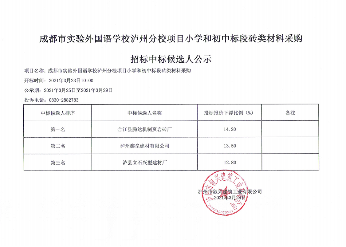 成都市實驗外國語學(xué)校瀘州分校項目小學(xué)和初中標(biāo)段磚類材料采購招標(biāo)中標(biāo)候選人公示 作者: 來源: 日期:2021-03-24 瀏覽次數(shù): 次 【字體:小 大】 【打印正文】