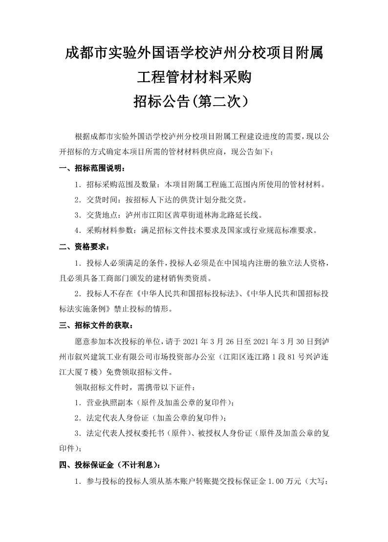 成都市實(shí)驗(yàn)外國語學(xué)校瀘州分校項(xiàng)目附屬工程管材材料采購招標(biāo)公告(第二次) 作者: 來源: 日期:2021-03-25 瀏覽次數(shù): 次 【字體:小 大】 【打印正文】