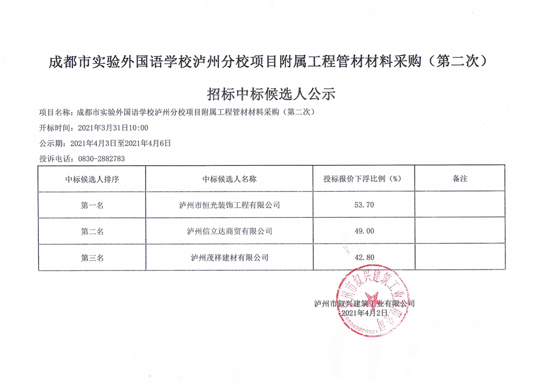 成都市實(shí)驗(yàn)外國(guó)語(yǔ)學(xué)校瀘州分校項(xiàng)目附屬工程管材材料采購(gòu)(第二次)招標(biāo)中標(biāo)候選人公示 作者: 來(lái)源: 日期:2021-04-02 瀏覽次數(shù): 次 【字體:小 大】 【打印正文】