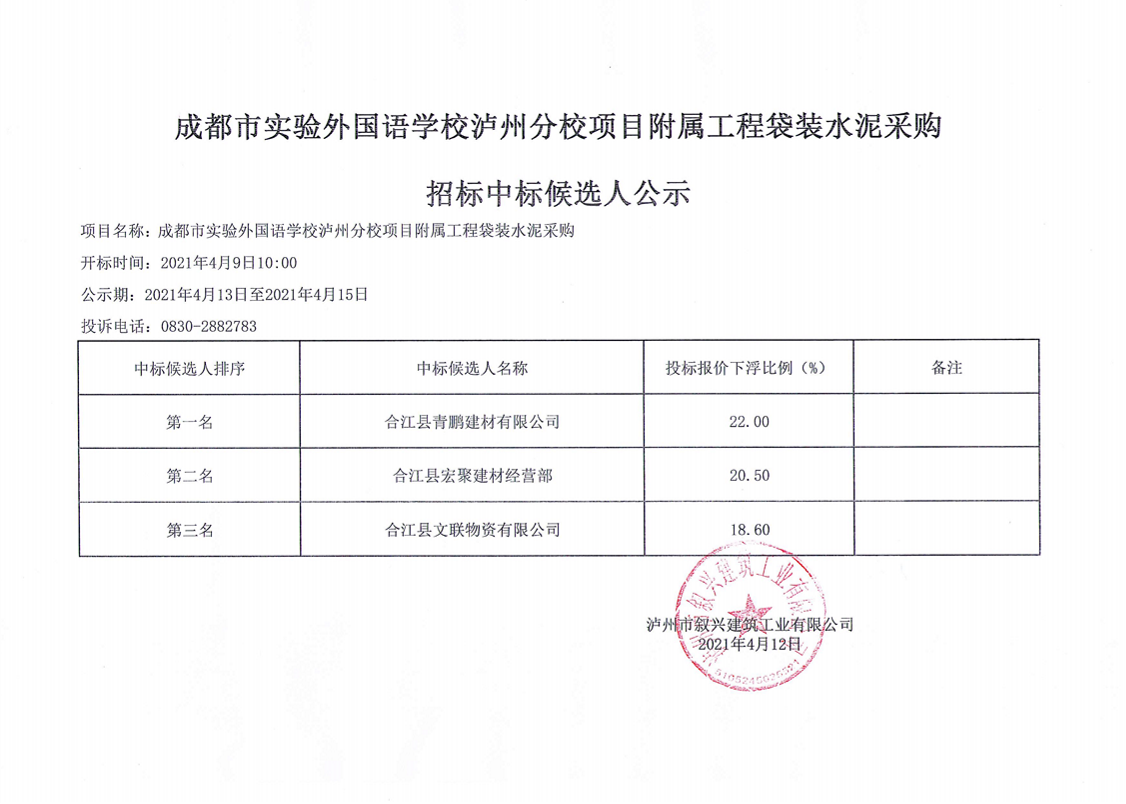 成都市實驗外國語學校瀘州分校項目附屬工程袋裝水泥采購招標中標候選人公示