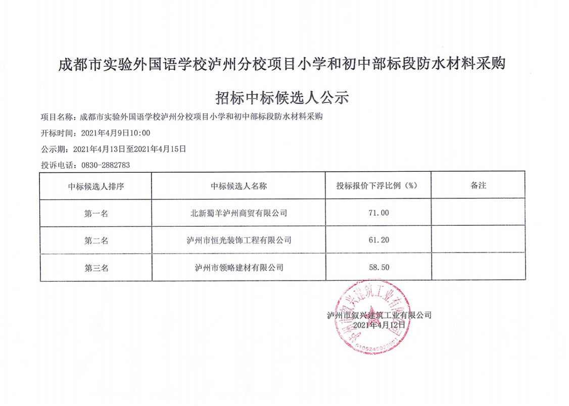 成都市實驗外國語學校瀘州分校項目小學和初中部標段防水材料采購招標中標候選人公示