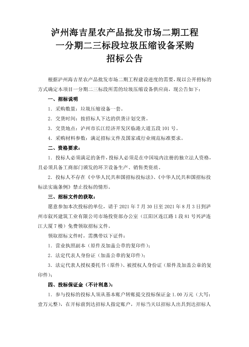 瀘州海吉星農(nóng)產(chǎn)品批發(fā)市場二期工程一分期二三標(biāo)段垃圾壓縮設(shè)備采購招標(biāo)公告 作者: 來源: 日期:2021-07-29 瀏覽次數(shù): 次 【字體:小 大】 【打印正文】