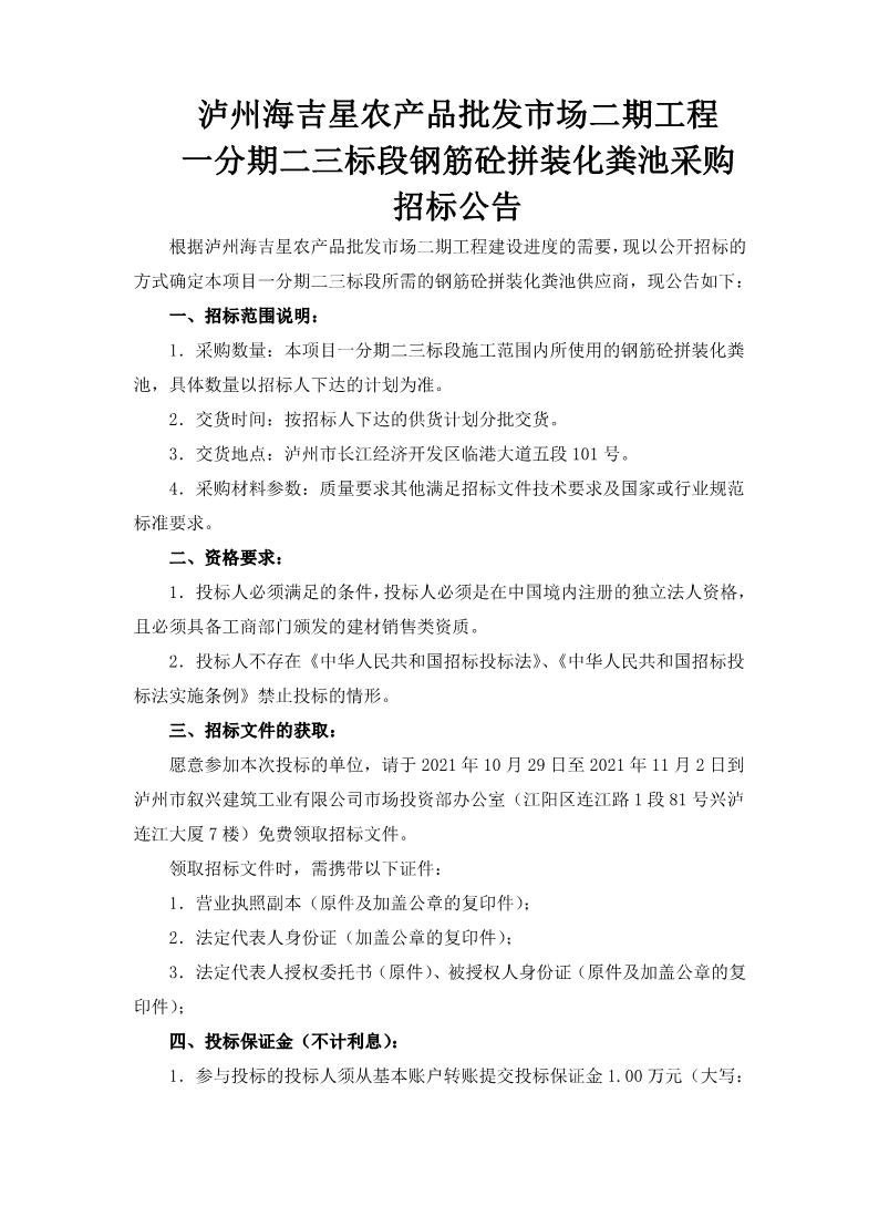 瀘州海吉星農(nóng)產(chǎn)品批發(fā)市場(chǎng)二期工程一分期二三標(biāo)段鋼筋砼拼裝化糞池采購(gòu)招標(biāo)公告 作者: 來(lái)源: 日期:2021-10-28 瀏覽次數(shù): 次 【字體:小 大】 【打印正文】