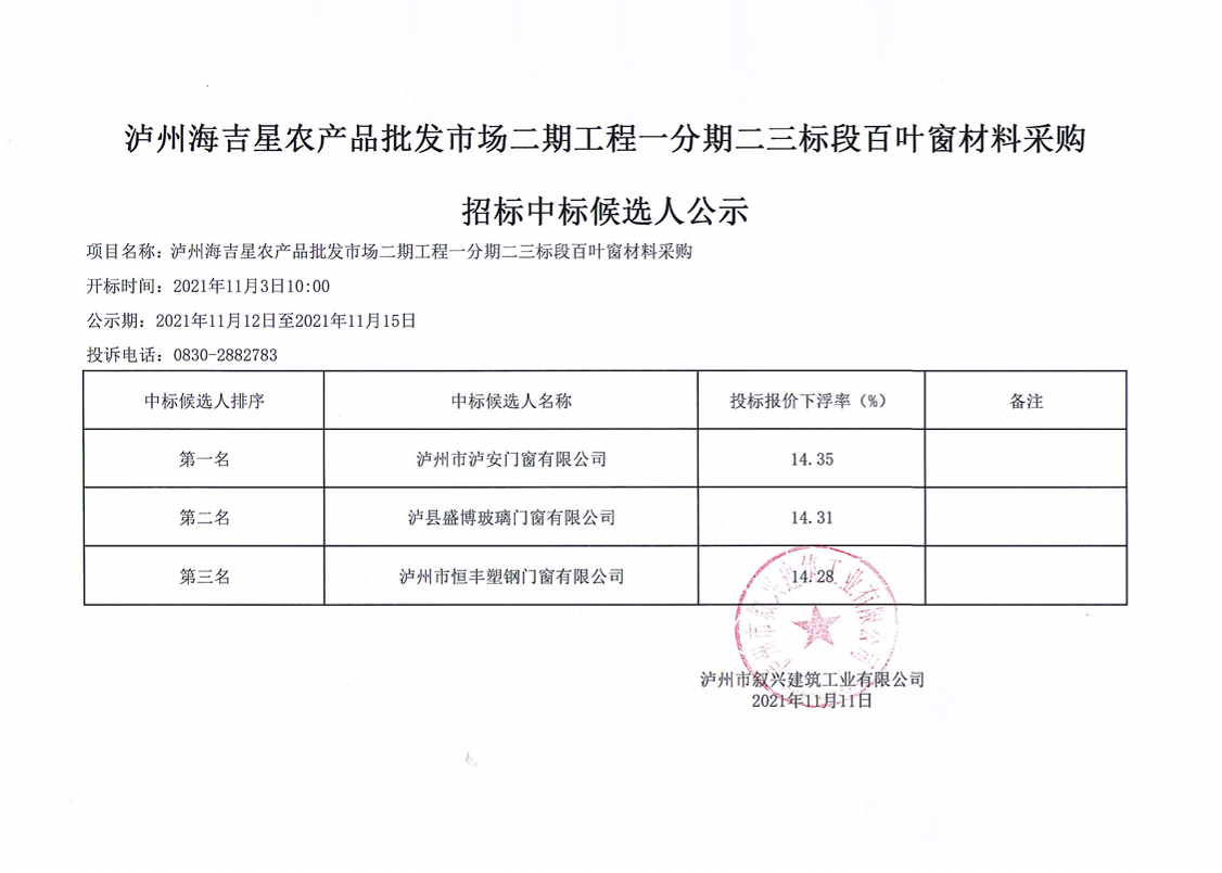 瀘州海吉星農(nóng)產(chǎn)品批發(fā)市場(chǎng)二期工程一分期二三標(biāo)段百葉窗材料采購(gòu)招標(biāo)中標(biāo)候選人公示 作者: 來(lái)源: 日期:2021-11-11 瀏覽次數(shù): 次 【字體:小 大】 【打印正文】