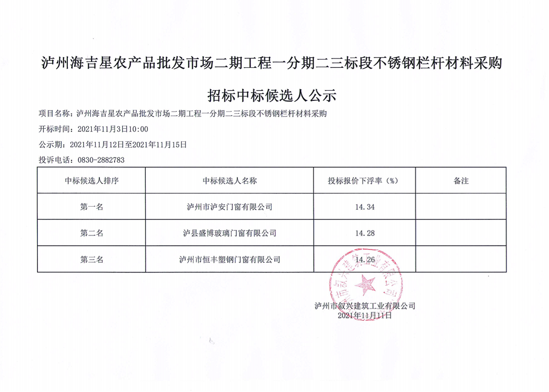 瀘州海吉星農(nóng)產(chǎn)品批發(fā)市場二期工程一分期二三標段不銹鋼欄桿材料采購招標中標候選人公示 作者: 來源: 日期:2021-11-11 瀏覽次數(shù): 次 【字體:小 大】 【打印正文】