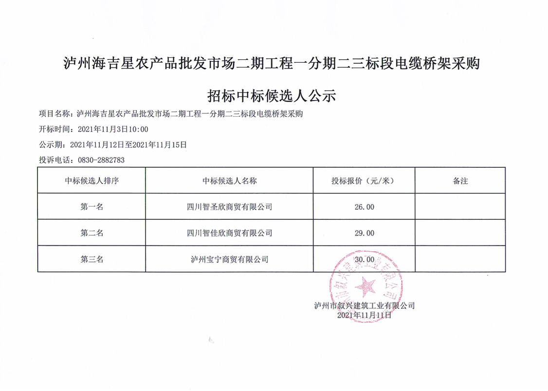 瀘州海吉星農(nóng)產(chǎn)品批發(fā)市場二期工程一分期二三標(biāo)段電纜橋架采購招標(biāo)中標(biāo)候選人公示 作者: 來源: 日期:2021-11-11 瀏覽次數(shù): 次 【字體:小 大】 【打印正文】