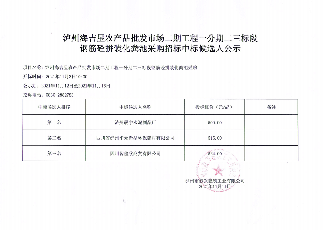 瀘州海吉星農(nóng)產(chǎn)品批發(fā)市場二期工程一分期二三標(biāo)段鋼筋砼拼裝化糞池采購招標(biāo)中標(biāo)候選人公示 作者: 來源: 日期:2021-11-11 瀏覽次數(shù): 次 【字體:小 大】 【打印正文】