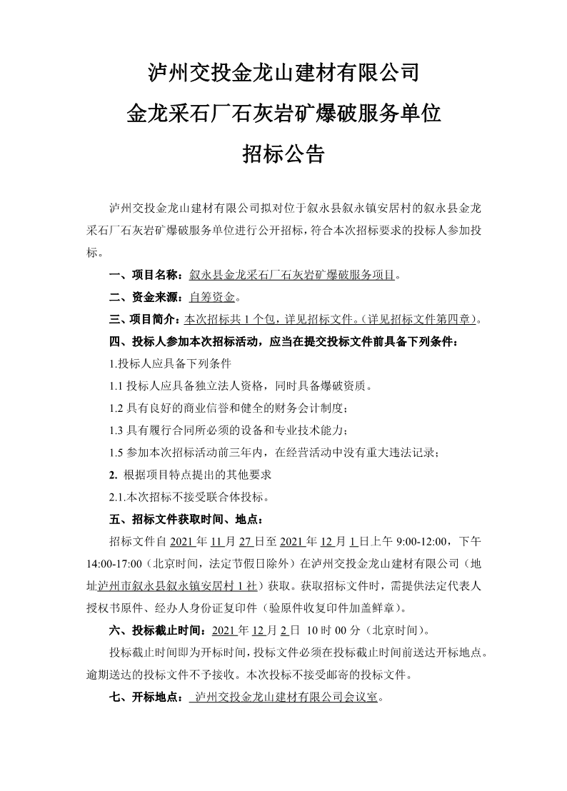 瀘州交投金龍山建材有限公司金龍采石廠石灰?guī)r礦爆破服務(wù)單位招標(biāo)公告