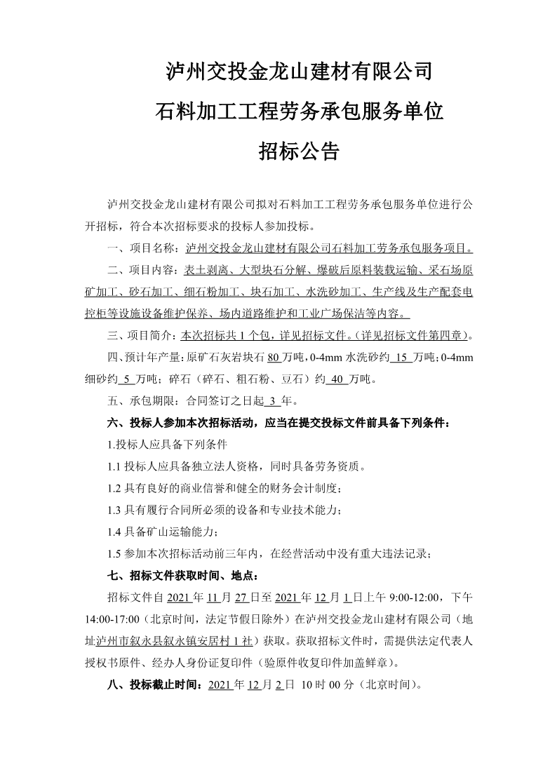 瀘州交投金龍山建材有限公司石料加工工程勞務(wù)承包服務(wù)單位招標(biāo)公告 作者: 來(lái)源: 日期:2021-11-26 瀏覽次數(shù): 次 【字體:小 大】 【打印正文】