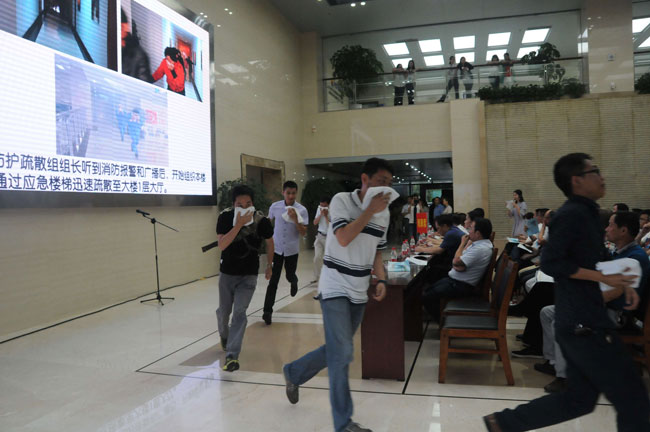 下午16時(shí)30分演練開始,興瀘集團(tuán)啟動(dòng)了應(yīng)急預(yù)案,并采取對(duì)應(yīng)措施,組織人員緊急疏散。疏散人員沿著大樓消防樓梯,使用濕毛巾捂住口鼻,彎腰有序地撤離火災(zāi)現(xiàn)場(chǎng);消防官兵使用搶險(xiǎn)車、水罐車、登高噴射車展開滅火戰(zhàn)斗,幫助被困人員使用大樓緩降器成功逃生;市120應(yīng)急辦緊急調(diào)動(dòng)救護(hù)車趕到演練現(xiàn)場(chǎng),對(duì)“受傷”人員進(jìn)行緊急救護(hù)。經(jīng)過十多分鐘緊張滅火救援,大樓所有人員安全轉(zhuǎn)移。
